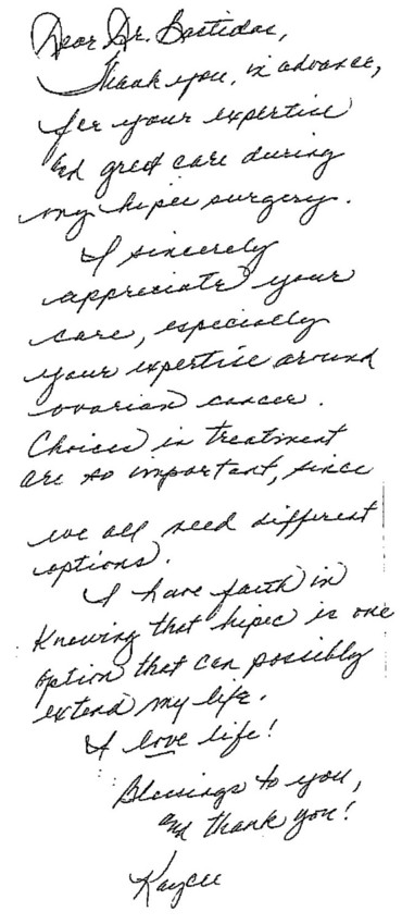 I would like to thank you so very much for taking such wonderful care of me. If it was not for your skills and expertise as an amazing doctor the mass in my stomach would not have been found. You are the only doctor in the past two years that was the real problem and the cause of my pain. I cannot tahnk you enough; my family is so very thankful to you as well.
